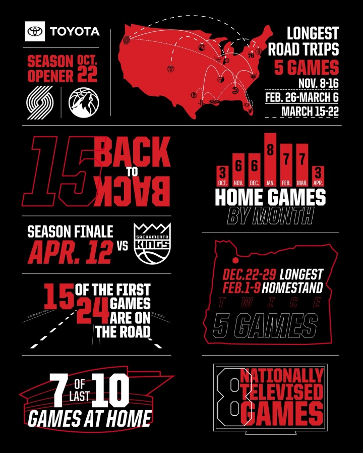 开拓者新赛季赛程公布:全美直播8场 15次背靠背 首战迎战森林狼