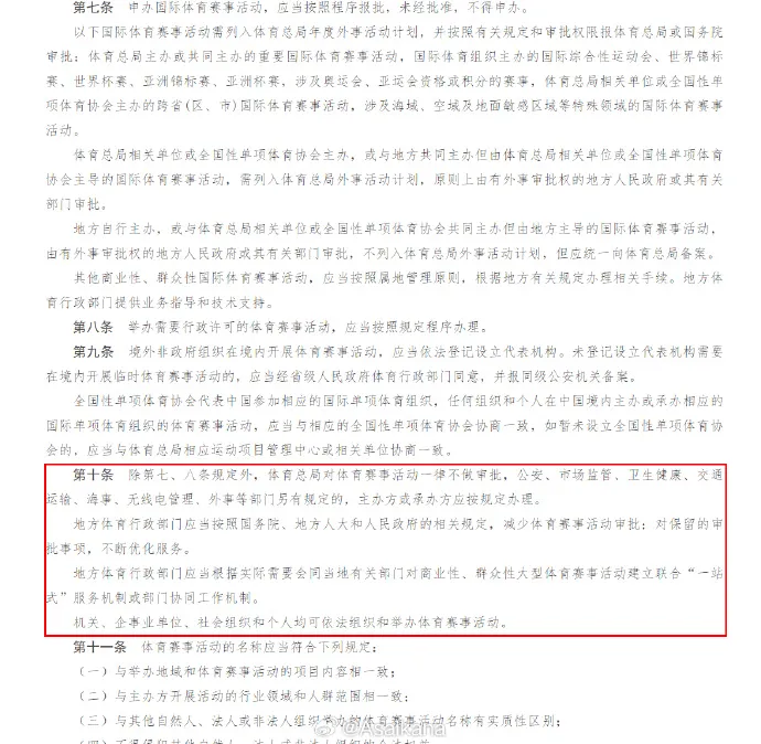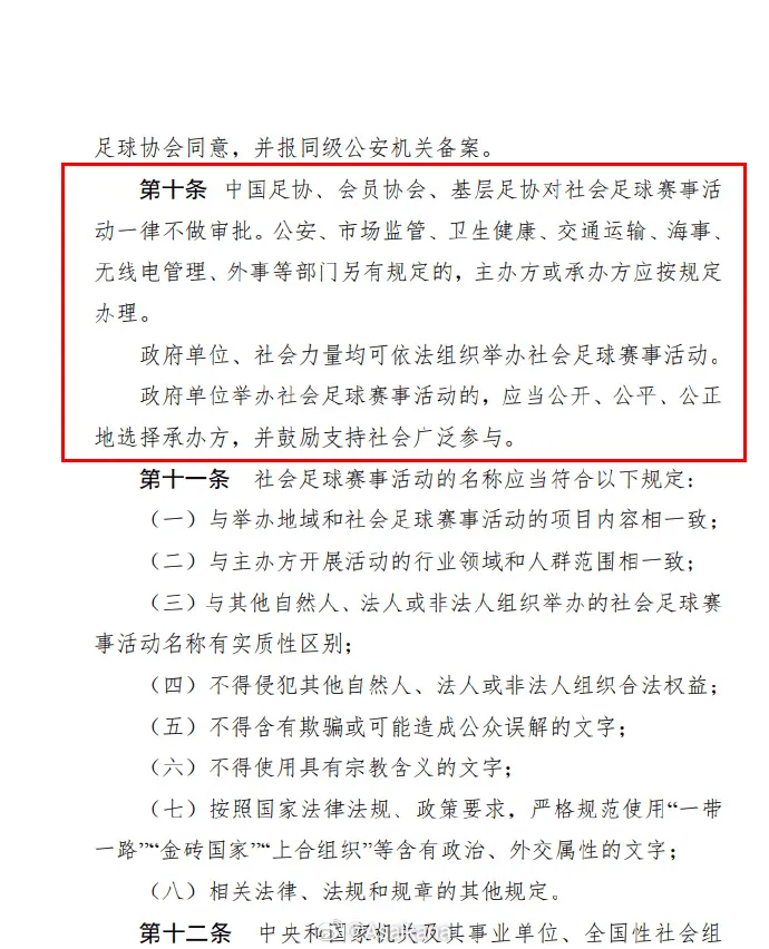 第十条:“中国足协、会员协会、基层足协对社会足球赛事活动一律不做审批。公安、市场监管、卫生健康、交通运输、海事、无线电管理、外事等部门另有规定的,主办方或承办方应按规定办理。
