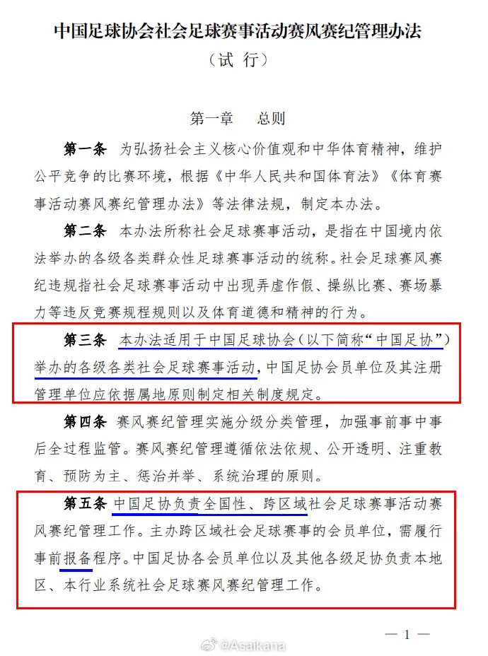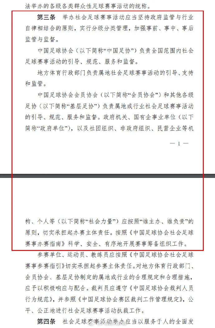 第三条:“本办法适用于中国足球协会(以下简称“中国足协”)举办的各级各类社会足球赛事活动,中国足协会员单位及其注册管理单位应依据属地原则制定相关制度规定。”看明白了吗?
