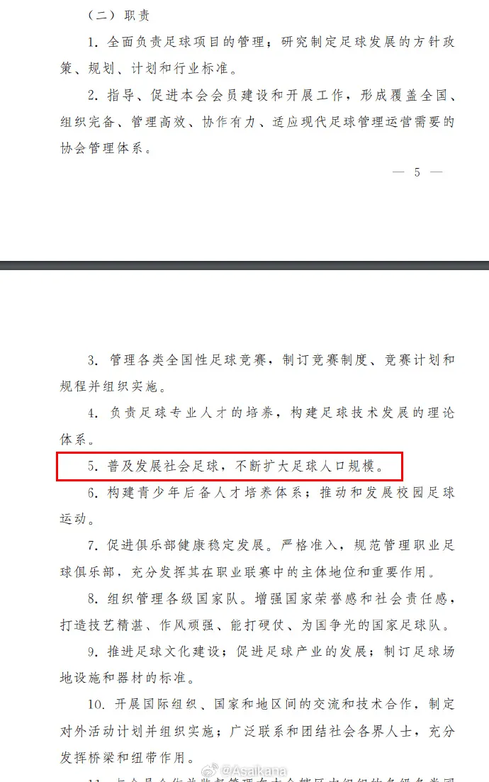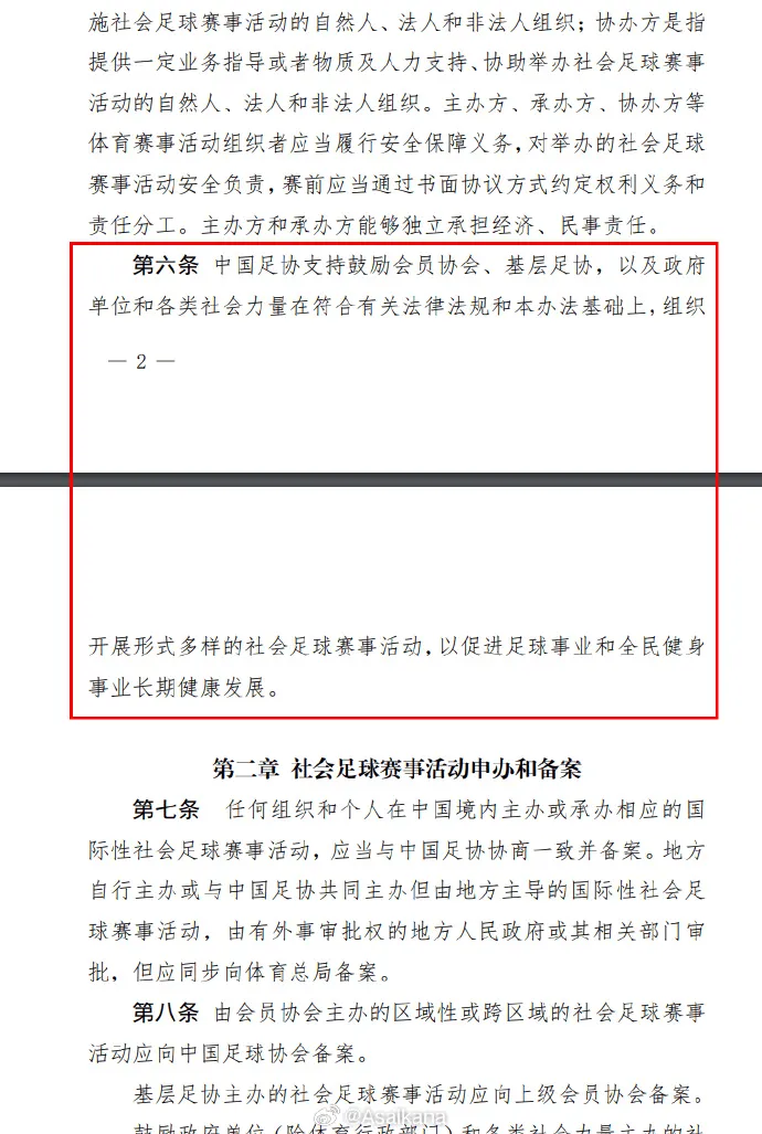 第六条:“中国足协支持鼓励会员协会、基层足协,以及政府单位和各类社会力量在符合有关法律法规和本办法基础上,组织开展形式多样的社会足球赛事活动,以促进足球事业和全民健身事业长期健康发展。”