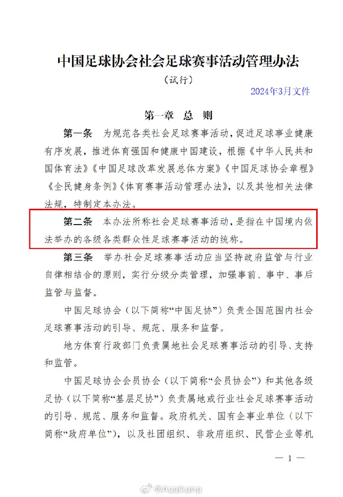 2024年3月22日中国足协印发的《中国足球协会社会足球赛事活动管理办法(试行)》(网页链接 ):第三条:“举办社会足球赛事活动应当坚持政府监管与行业自律相结合的原则,实行分级分类管理,加强事前、事中、事后监管与监督。