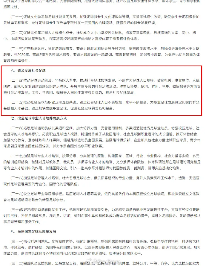 (二十五)推动社会足球与职业足球互促共进。通过社会足球人口不断增加、水平不断提高,为职业足球发展奠定扎实的群众基础和人才基础。通过加快发展职业足球,促进社会足球的普及和提高。”